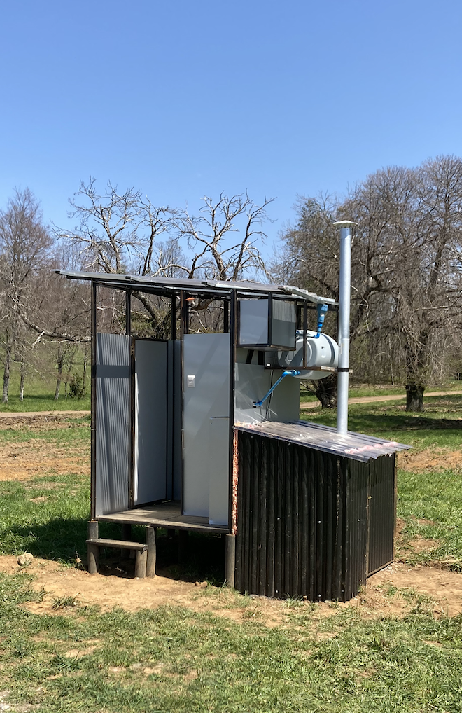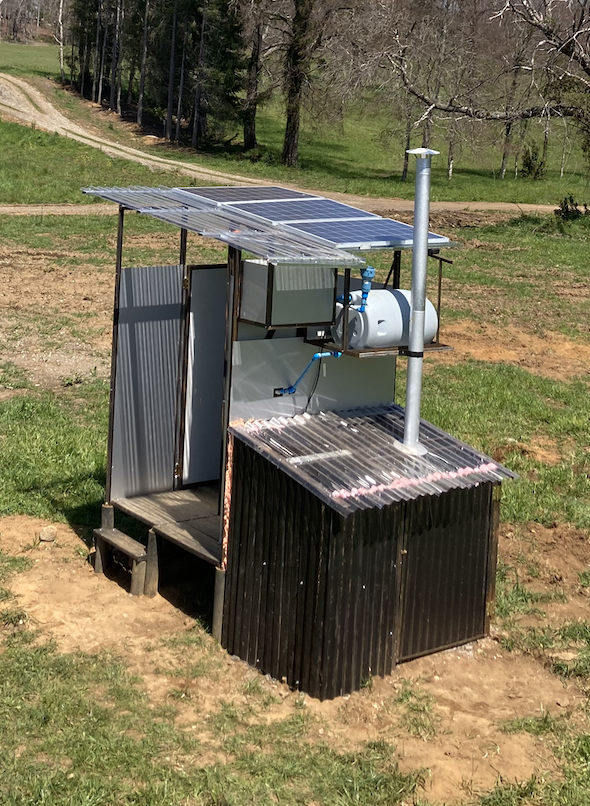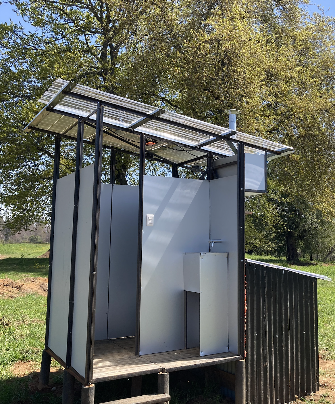Exteriormente cuenta con una cámara de deshidratación y paneles solares en el techo, lo que permite tener luz, ventilación y funcionamiento del lavamanos.