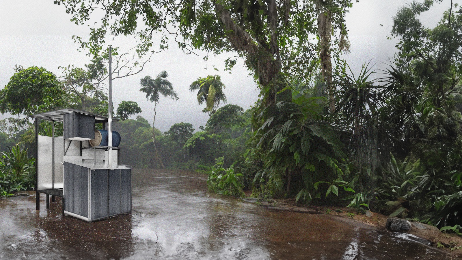 Exteriormente cuenta con una cámara de deshidratación y paneles solares en el techo, lo que permite tener luz, ventilación y funcionamiento del lavamanos. Además posee un sistema de recolección de aguas lluvia y/o neblina para el uso del lavamanos y dilución de la orina.